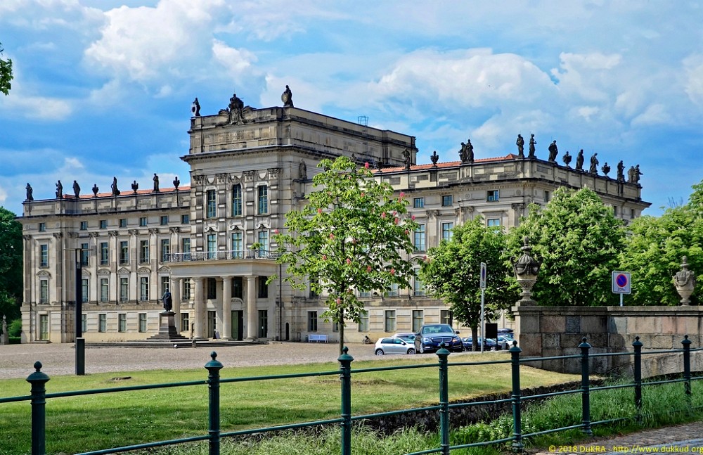 Ludwigslust - Schloss Ludwigslust, Schloßplatz, aus dem Jahre 1776 von Johann Friedrich Künnecke und Johann Joachim Busch, allegorische Figuren auf der Attika von Rudolf Kaplunger 09